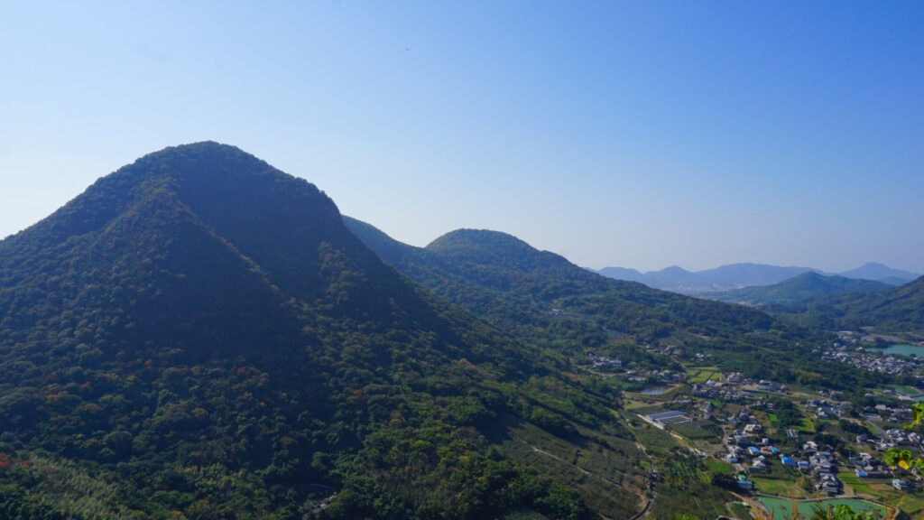 After a short uphill section to the next summit (at 439 meters), you’ll go downhill underneath a shady canopy before going up again towards the last summit (at 409 meters) of the day. Next, prepare for a steep downhill section (use a walking stick or hiking poles!) as you make your way back down towards a less challenging urban environment. Follow paved roads to reach Shussaka temple and look up to see the great heights you just descended from! After one last gentle climb up a paved road, you’ll reach the Gahaishi trailhead again (where you crossed the road earlier).